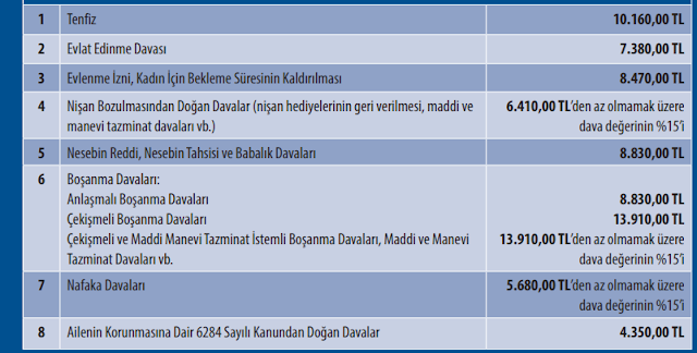 yukarıda tabloda Her yıl Resmi Gazete de yayımlanan Avukatlık Asgari Ücret Tarifesi en alt sınırı bulunmaktadır . Yine bu tarife göz önüne alınarak avukatın bağlı bulunduğu Baro tarafından da tavsiye niteliğinde alt sınır vekalet ücretleri belirlenir.
