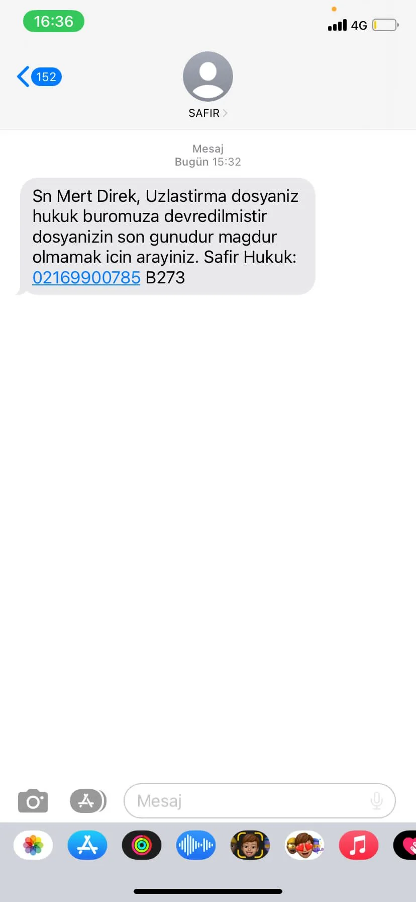 Aşağıda görüldüğü üzeri dolandırıcılar tarafından kişiye bir gerçek olmayan bir hukuk bürosu tarafından atılmış mesaj örneklerini mesaj görüyorsunuz.